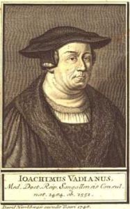 Joachim Vadian lived from November 29, 1484 to April 6, 1551. He was a humanist, professor, rector of the University of Vienna 1516-1517, physician, burgomaster, and Protestant Reformer from Switzerland. He knew and was a staunch supporter of Zwingli. He also was a strong force against the growing Anabaptist movement. In Vienna, he changed his name to “Joachimus Vadianus”; like so many other humanists, he preferred a Latin name to express his admiration for the classic masters. He was able to evade the “Black Plague” by moving to Villach, Austria.. He worked as a teacher and studied music. After completing his studies in 1509 with a degree of Master of Arts, he returned to St. Gallen. He would go on to study the scriptures. He would return to Vienna and have some success as a writer. From 1512 on he held the chair of poetry at the University of Vienna – gaining some reputation for authoring Latin poems. In 1517, the year Luther nailed the 95 Theses on the church door in Wittenberg, Vadian graduated as a doctor of medicine, and moved back to his hometown, St. Gallen. He was appointed the city physician and married Martha Grebel, the sister of Conrad Grebel who would later become a leading figure of the Anabaptist movement.