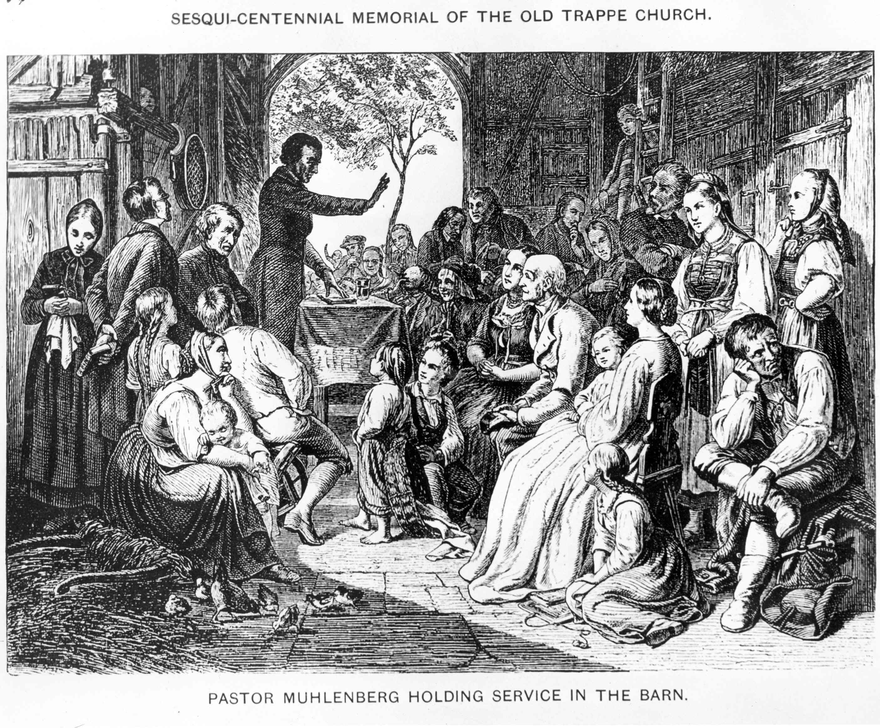 When Lutherans in Colonial America first gathered for worship, they gathered initially in barns, private homes, even vacant shops. As time marched forward, churches would be built, usually designed and constructed by the parishioners. Most were constructed of logs, few of stone or brick. But the log churches would not last long before the ground timbers began to rot and the roof would begin to leak. Amazingly, the average life of a log church was about 20 to 30 years – and it was usually easier to build a new one than try to fix the one that was rotting. Within a century a congregation might build four log churches. It is no surprise that as soon as a congregation could afford it, they would build a church made of stone or brick. The minister was often the person overseeing the entire building process. Members of the congregation might donate labor, but the pastor would be responsible to contract with masons and carpenters for the major parts of construction. The churches were usually constructed with balconies on three sides and an elevated pulpit so the pastor could be seen from all levels of the building. Pews were made of plain boards, usually with straight backs, and often enclosed. Most churches were not heated. Most had bells hung in belfries to be rung to summon people to worship, funerals, and other special events.