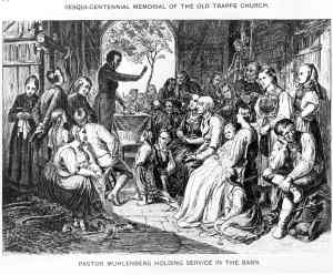 Often the cost of constructing a church could be reduced by erecting union churches. A union church, which we still encounter today, involves two congregations of different denominations (like Lutheran and German Reformed) sharing ownership and use of the property. The practice of building union churches was popular in the Upper Rhine Valley in Germany, and was imported along with emigrants from these parts. Some statistics from the 18th century suggest that as many as fifty percent of churches built in the colonial period were union churches. (Adapted and adopted from The Lutherans in North America, revised edition, E. Clifford Nelson)