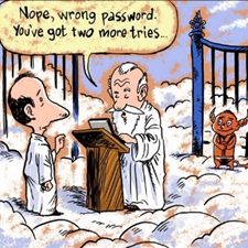 I like the cartoon associated with our reading today. Notice the little figure who is supposed to be Satan, I presume, just hovering in the background. If I were a betting man I believe it was Satan who came up with the idea of usernames and passwords. Of course the message behind this cartoon is all too familiar – many people believe there is some combination of username and password they must know to enter the kingdom of G-d. Of course, as Lutherans living by Faith and Grace we know this not true.